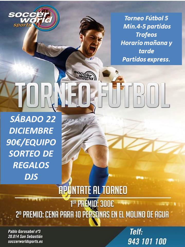 El próximo sábado 22 de diciembre se celebrará en Soccer World San Sebastián el Torneo de Navidad de F5. Comenzará sobre las 9.30h y durará hasta las 17.30h aproximadamente. El precio es de 90€ por equipo. Habrá premio en metálico y trofeo para los campeones, trofeo y cena para los subcampeones. Sorteo de regalos entre todos los participantes.